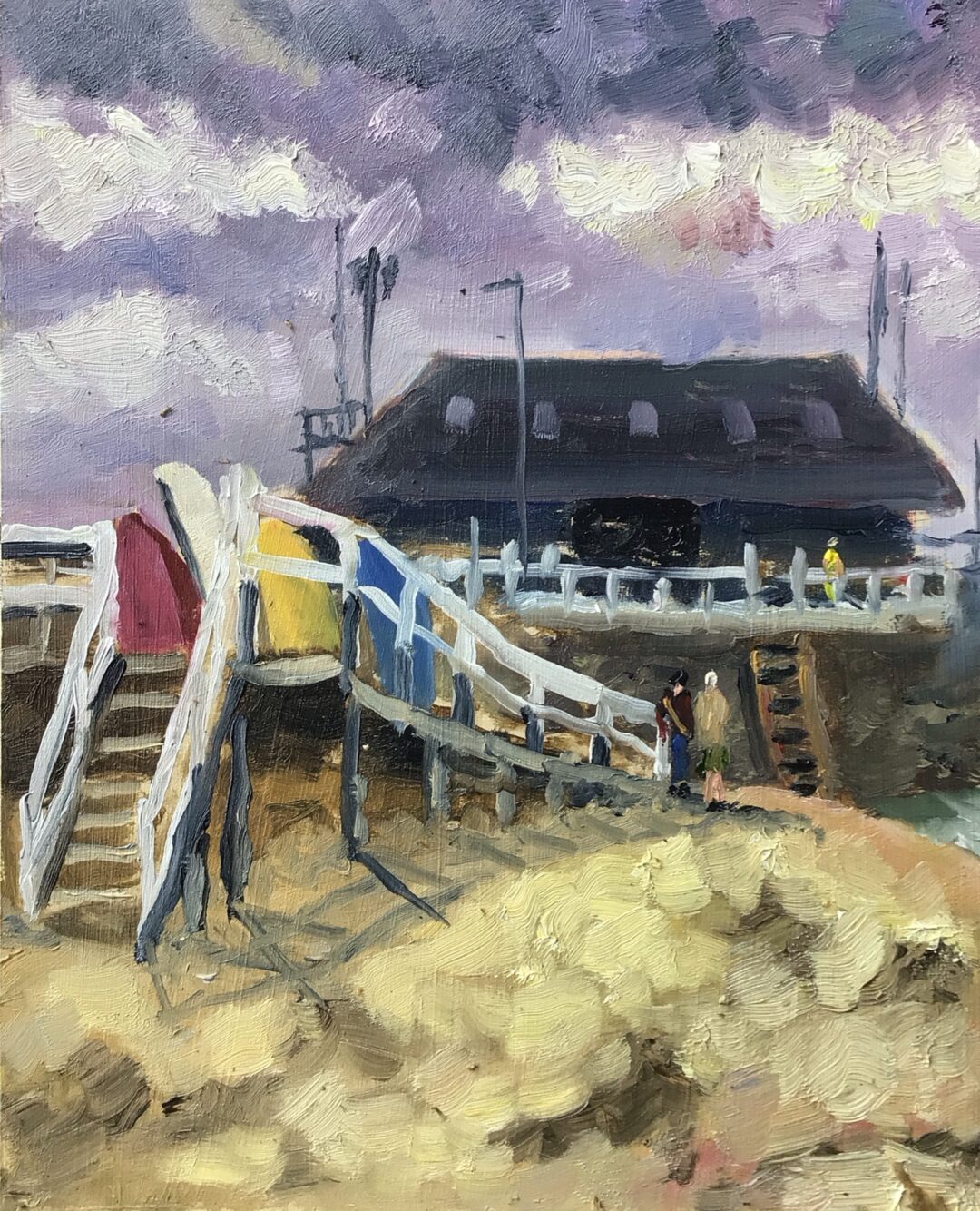 Here is Tuesday’s plein air at our local harbour. Its oils and size 14” x 10”, and a bit rough and ready. I was attracted by all the white timber railings, with the colourful boats standing up beyond. It is only a sketch, but I am not sure whether to tidy up the railings or leave them as they are?