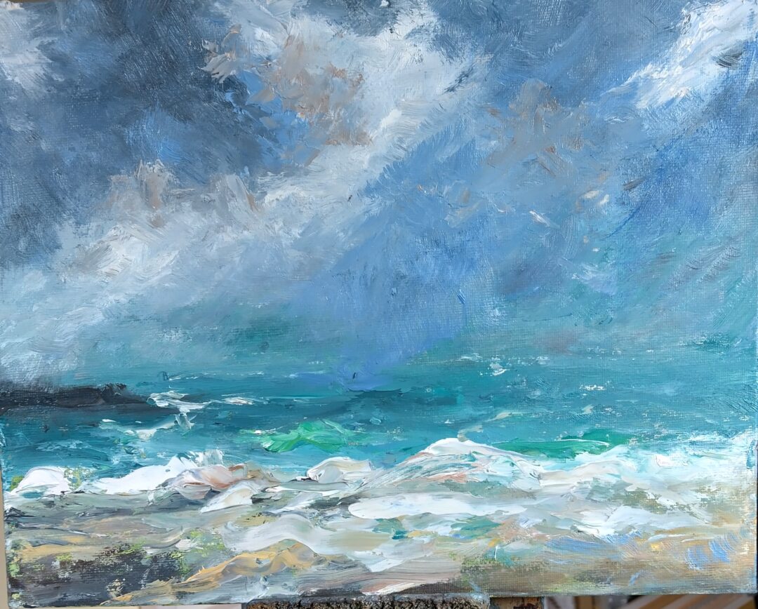 Oil painting, painted from my sketch off the sea using big brushes and heaps of paint and worked quickly . It was exhilarating and exhausting using the right