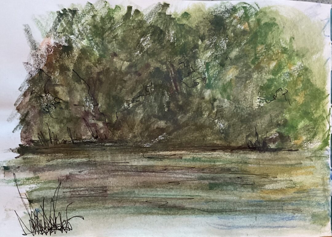 Rapid watercolour pencil sketch of the riverside